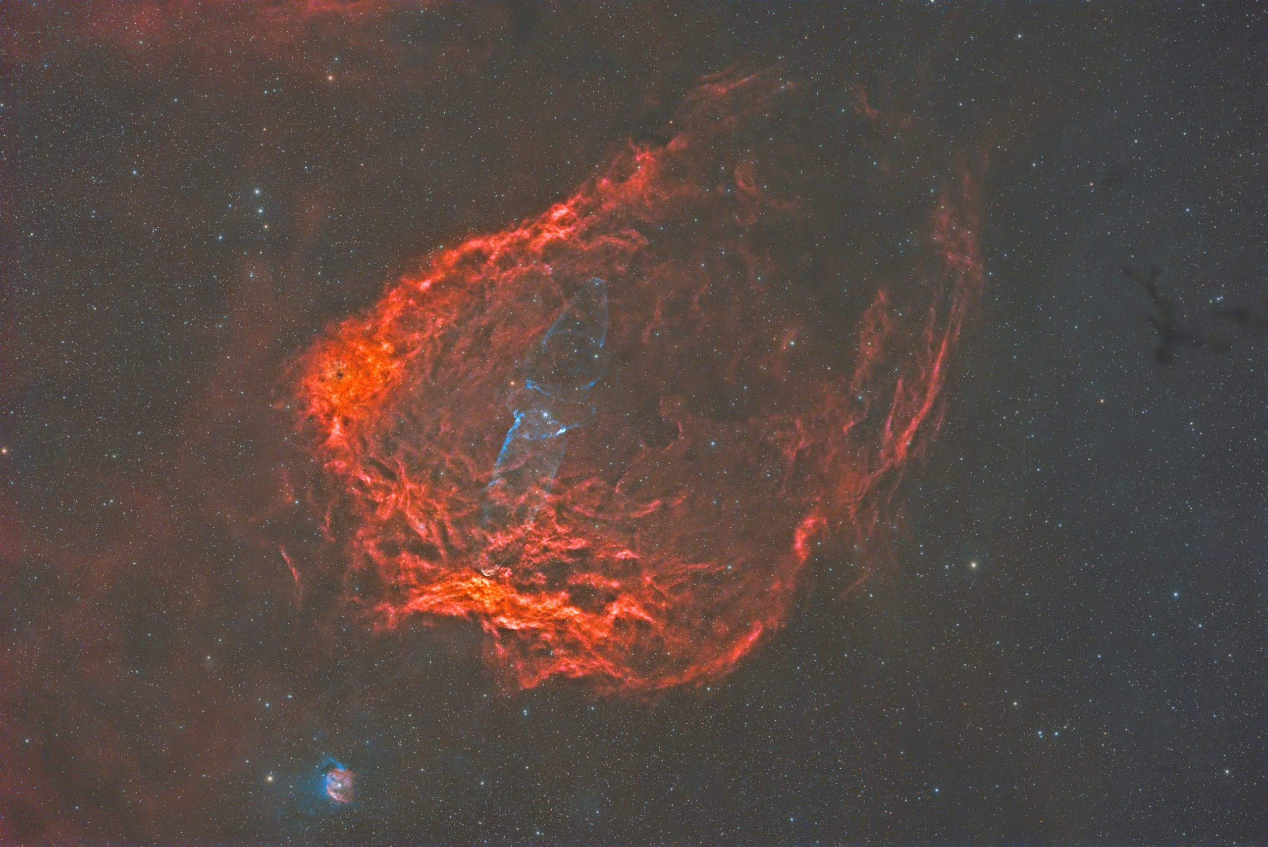 J’ai rassemblé cette image au fil de deux nuits paisibles en Suisse, partagées entre le ciel de la station de Rathvel et celui de ma maison. L’arc faible de WR 134 ne se dévoile qu’avec patience : 11 h 30 d’intégration, 23 poses de 600 s dans chacun des canaux S, H et O, ont été nécessaires pour révéler sa lueur délicate.