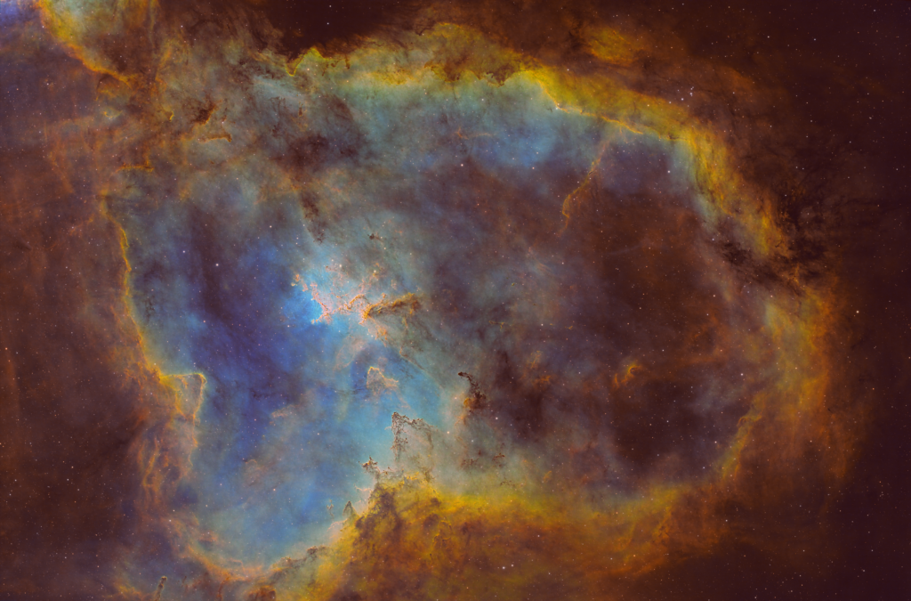 Pour capturer ce battement cosmique, j’ai consacré trois nuits claires à l’astrophotographie, accumulant plus de 19 heures d’exposition : 44 poses de 600 s en Hα, 44 poses de 600 s en O III et 26 poses de 600 s en S II. Les données ont été traitées dans PixInsight afin de révéler la profondeur des gaz grâce à la palette SHO (Hubble) : l’hydrogène rayonne en vert, le soufre en rouge, l’oxygène en bleu, offrant une vision à la fois scientifique et onirique.